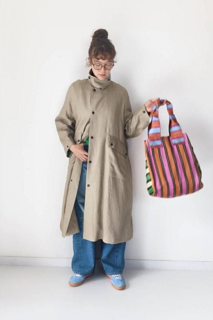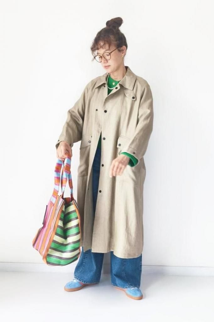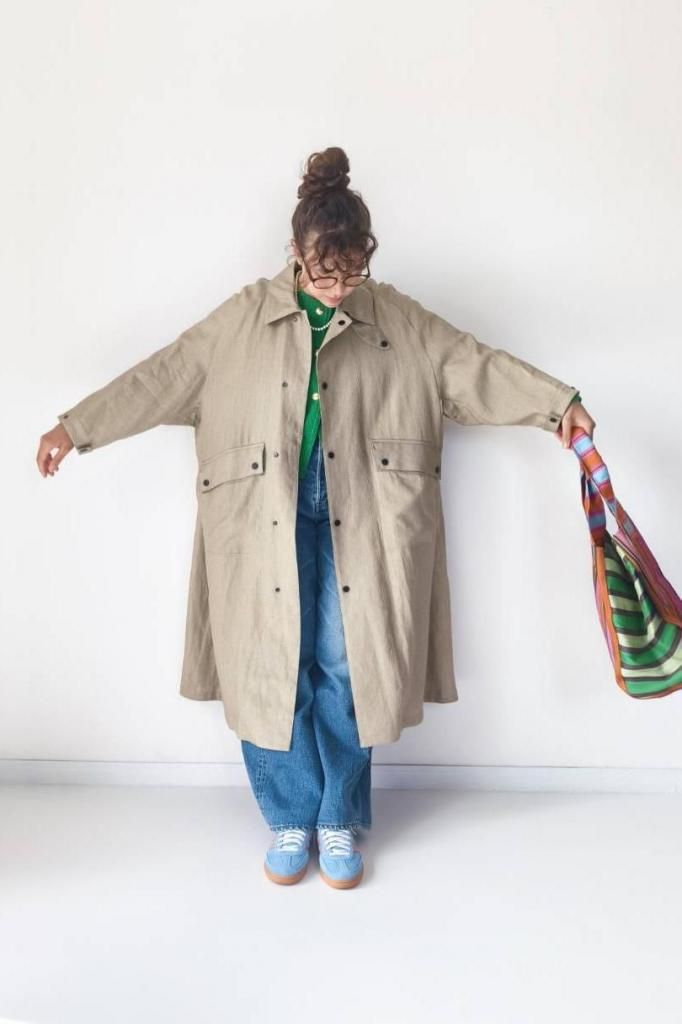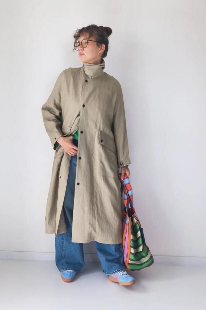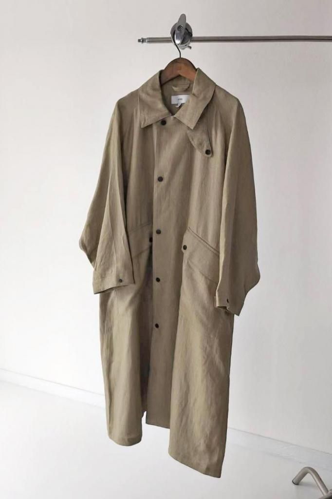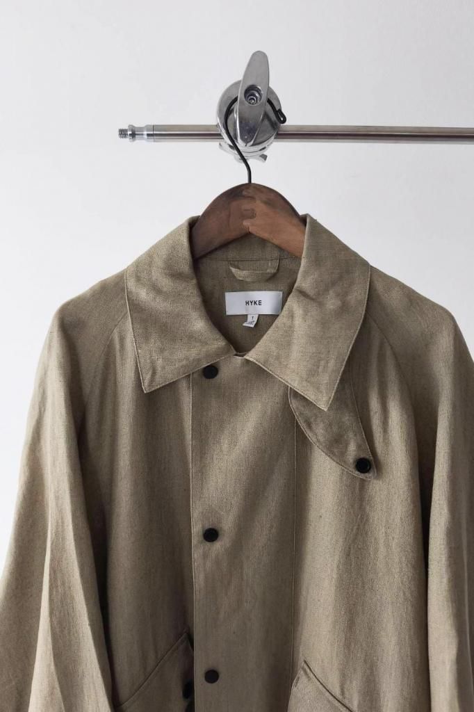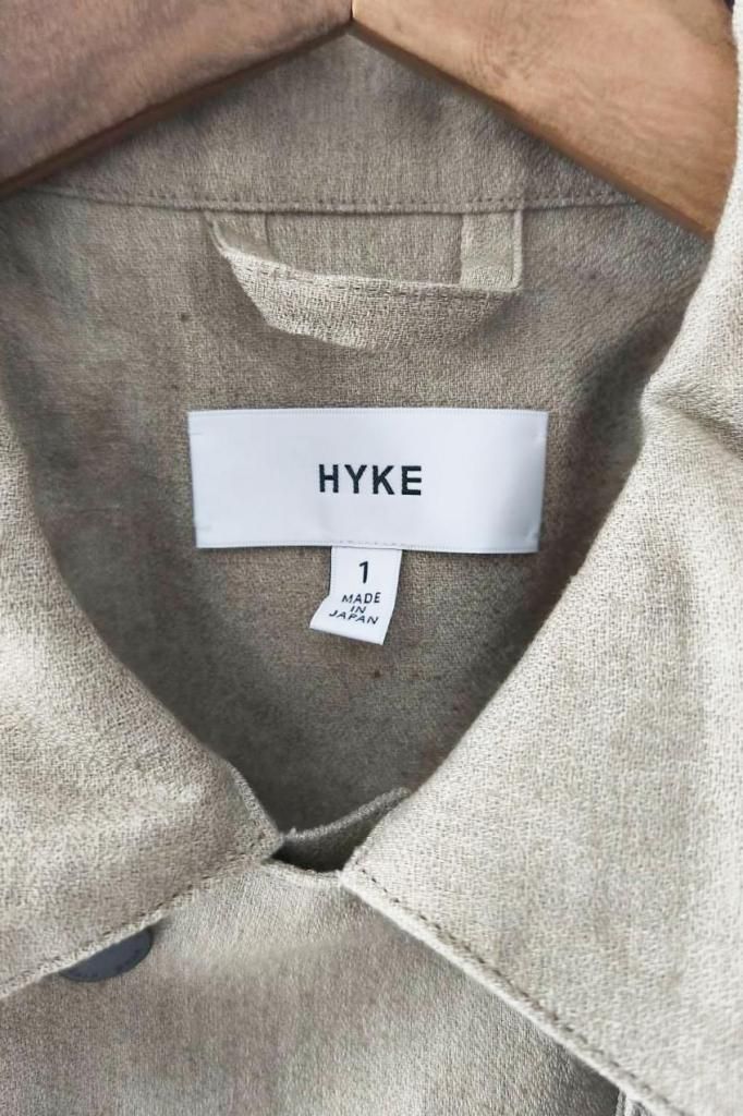 コレクションでも当時するHYKEのライディングコートです。90年代イギリス軍のライディングコートをサンプリングしてデザインされたコート。イギリス軍乗馬部隊が着用していたコートで、馬に股がる際に邪魔にならないよう裾にかけて広がるAラインシルエットも、再現されています。