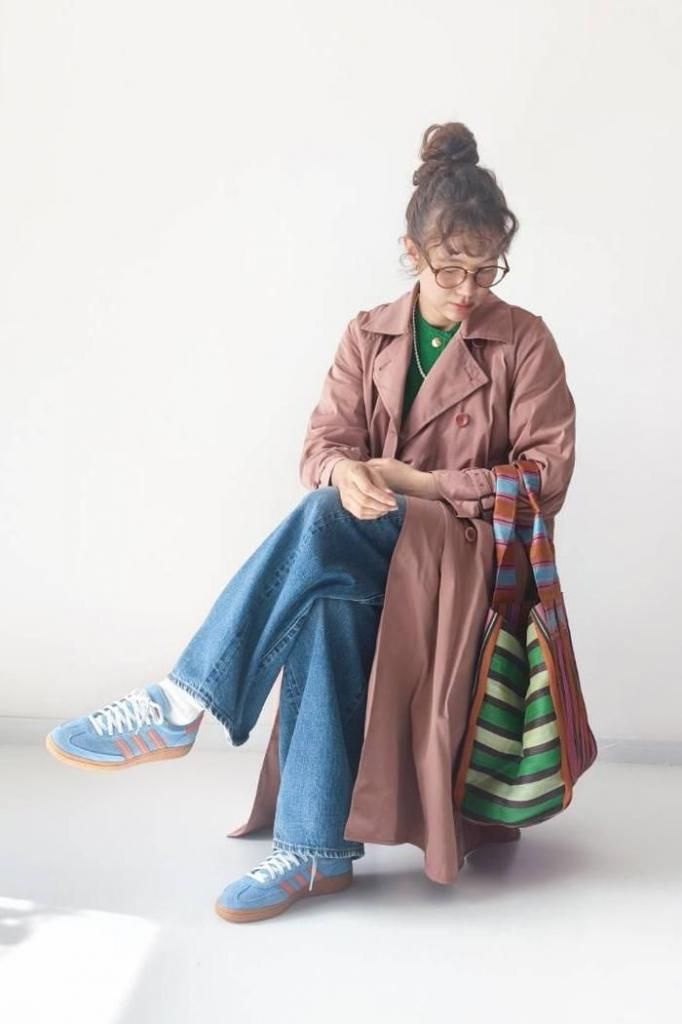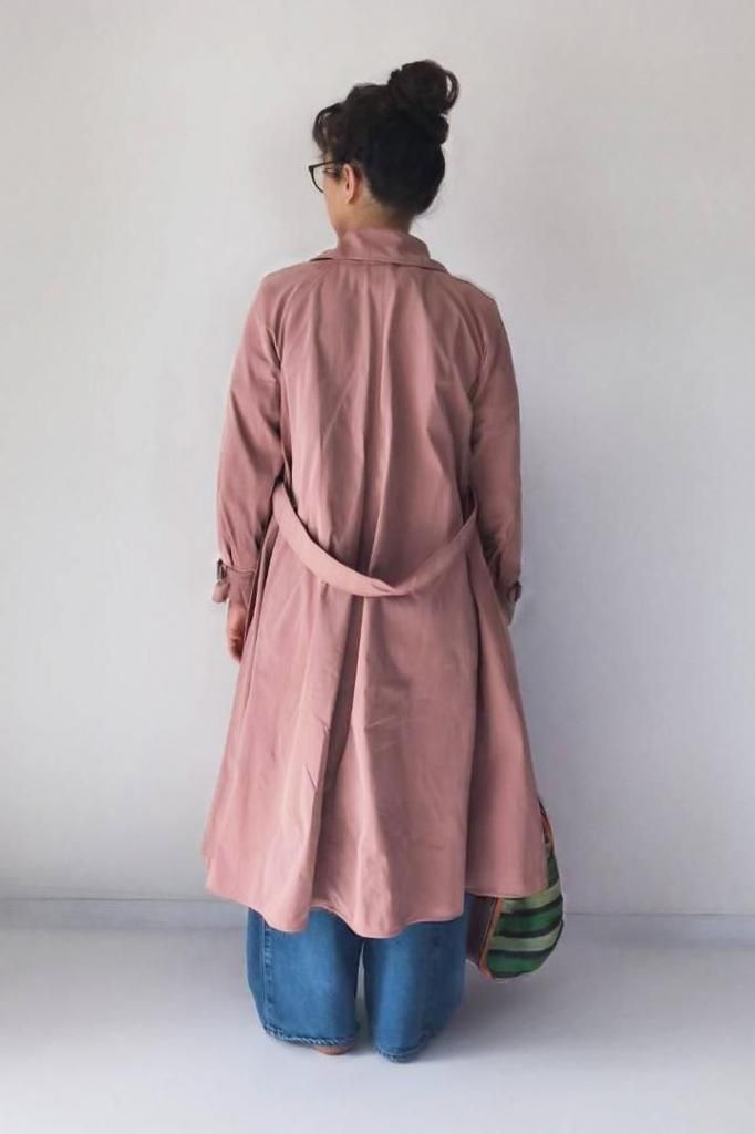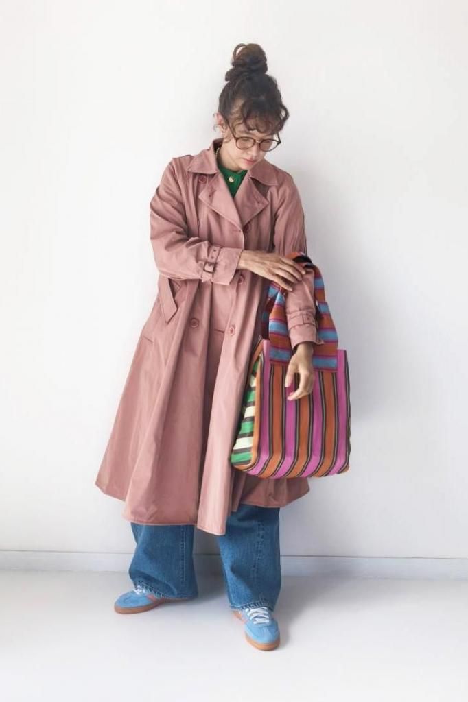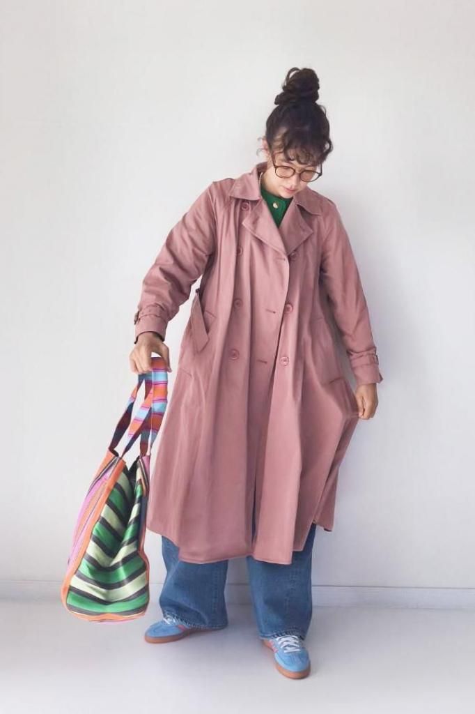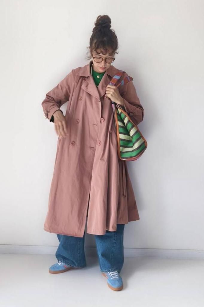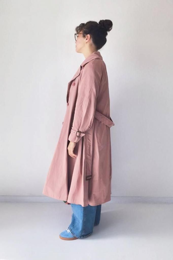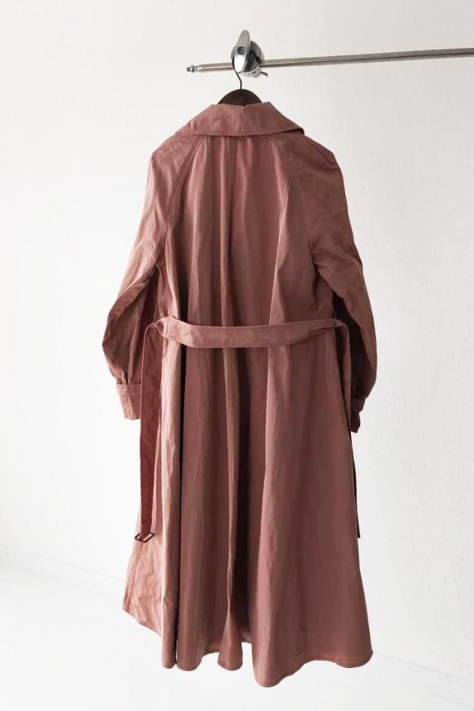 マッドなポリエステル素材のトレンチコートで、Aラインを描く、エレガントでありながらカジュアルな素材感が魅力の一枚。