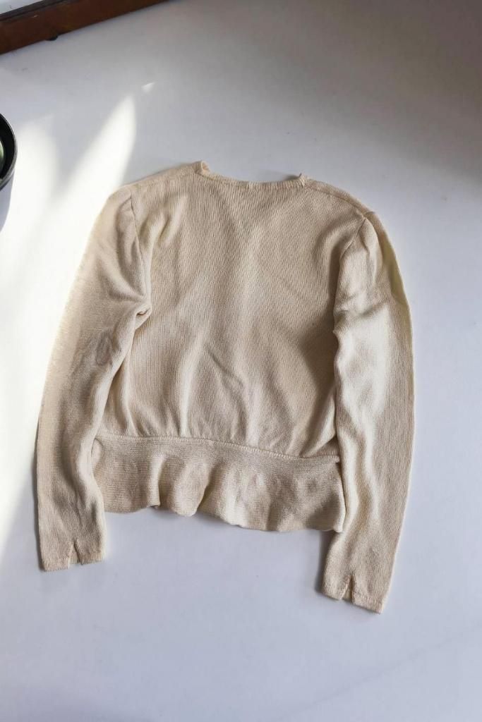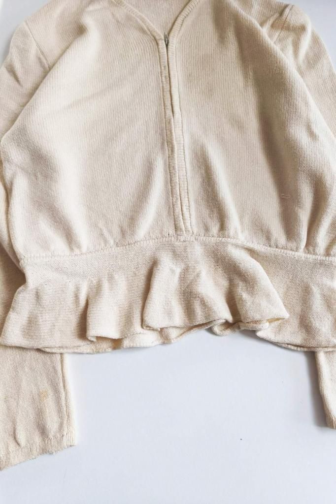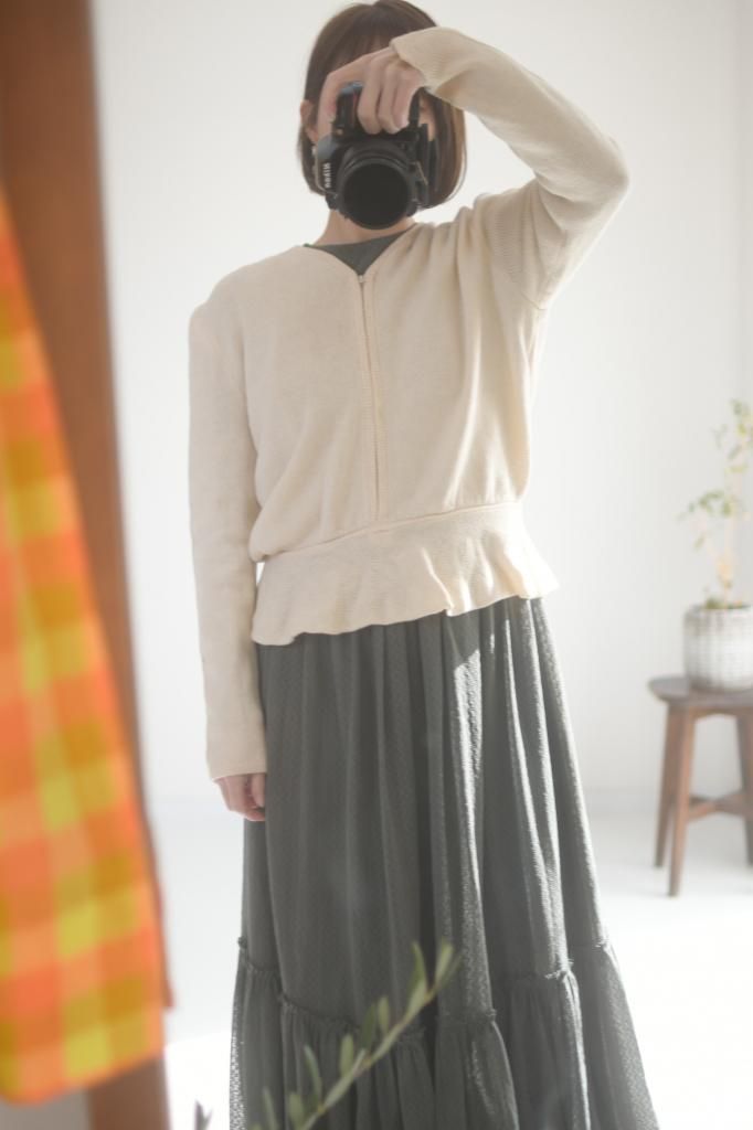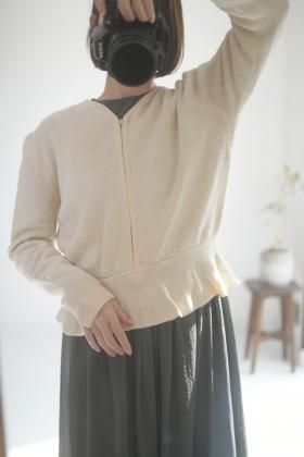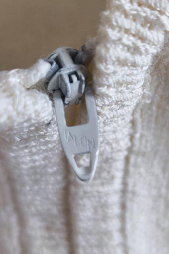面白いニットです。プルオーバータイプのニットで、ウエスト部分で切り替えがあり、そこから裾にフレアがつくペプラムデザイン。それでいてヴィンテージTALONジッパーが付く、ちゃんと古い洋服。こういったユニークなデザインは現代に馴染むし面白いですね。