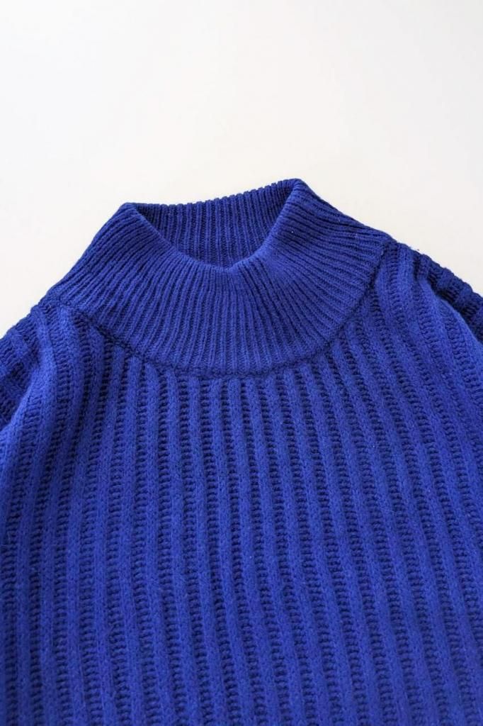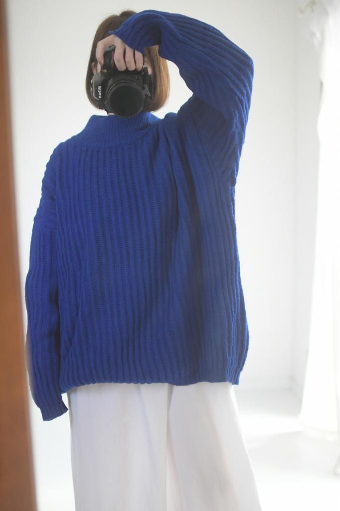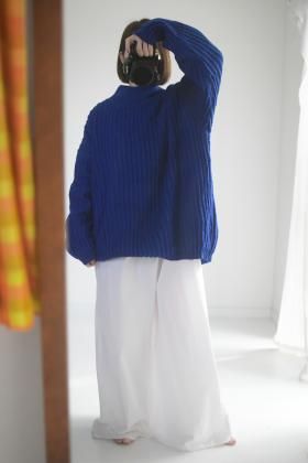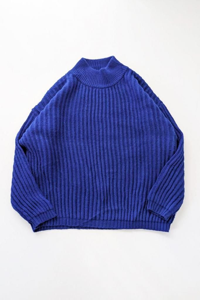 真っ青のブルーが綺麗なモックネックニット。身幅の広いオーバーサイズで、秋冬の街を彩る発色が素敵です。